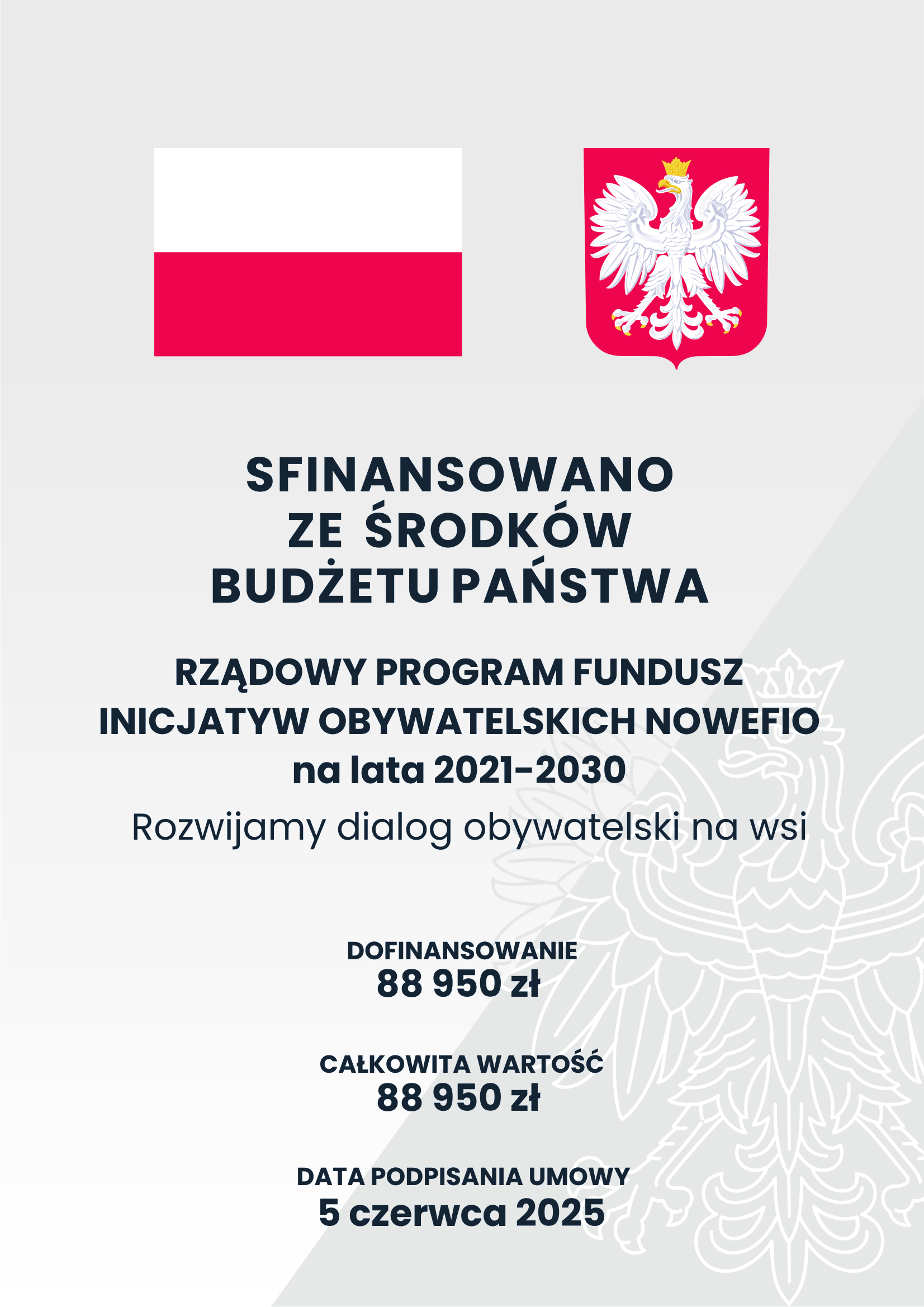 Z ogromną radością ogłaszamy, że nasze stowarzyszenie rozpoczęło realizację nowego, niezwykle ważnego projektu: „Rozwijamy dialog obywatelski na wsi”, który będzie trwał od 1 maja do 31 grudnia 2025 roku. Projekt ten powstał z potrzeby wzmocnienia głosu kobiet w życiu publicznym naszej wioski oraz gminy i został sfinansowany ze środków Narodowego Instytutu Wolności – Centrum Rozwoju Społeczeństwa Obywatelskiego, w ramach Programu Fundusz Inicjatyw Obywatelskich NOWEFIO na lata 2021–2030.