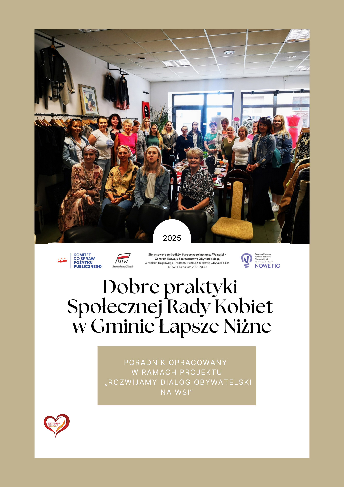 Poradnik dobrych praktyk Społecznej Rady Kobiet w Gminie Łapsze Niżne powstał w ramach projektu "Rozwijamy dialog obywatelski na wsi", realizowanego przez Stowarzyszenie Rozwoju Wsi Łapszanka. Publikacja jest efektem siedmiomiesięcznej pracy kobiet, które stworzyły Społeczną Radę Kobiet – przestrzeń dialogu, współpracy i wzmacniania kobiecego głosu w życiu publicznym. Poradnik w przystępny sposób pokazuje, krok po kroku, jak budować i prowadzić Radę Kobiet, opierając się na realnych doświadczeniach, dobrych praktykach i lokalnych potrzebach. To nie tylko podsumowanie projektu, ale także inspiracja i praktyczne narzędzie dla innych społeczności wiejskich, które chcą rozwijać partycypację obywatelską kobiet i budować wspólnotę opartą na dialogu, empatii i współpracy.